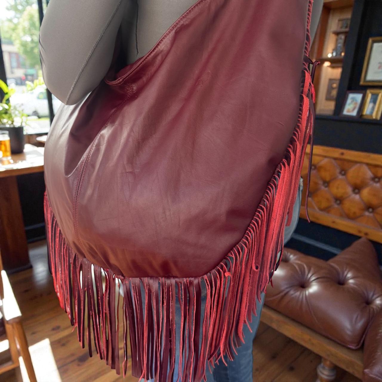 Cartera tipo hobo bag, 100% cuero vacuno, interior con forro impermeable y bolsillo, cierre con cremallera.