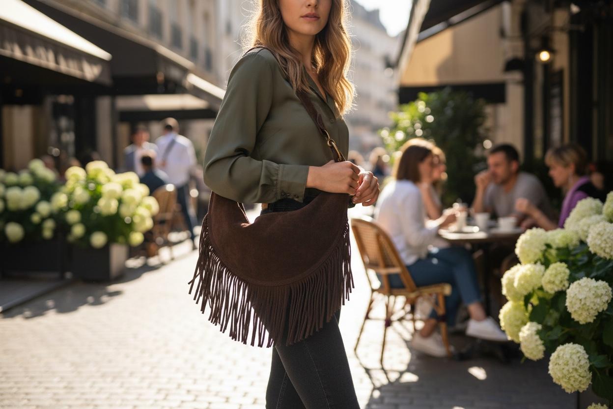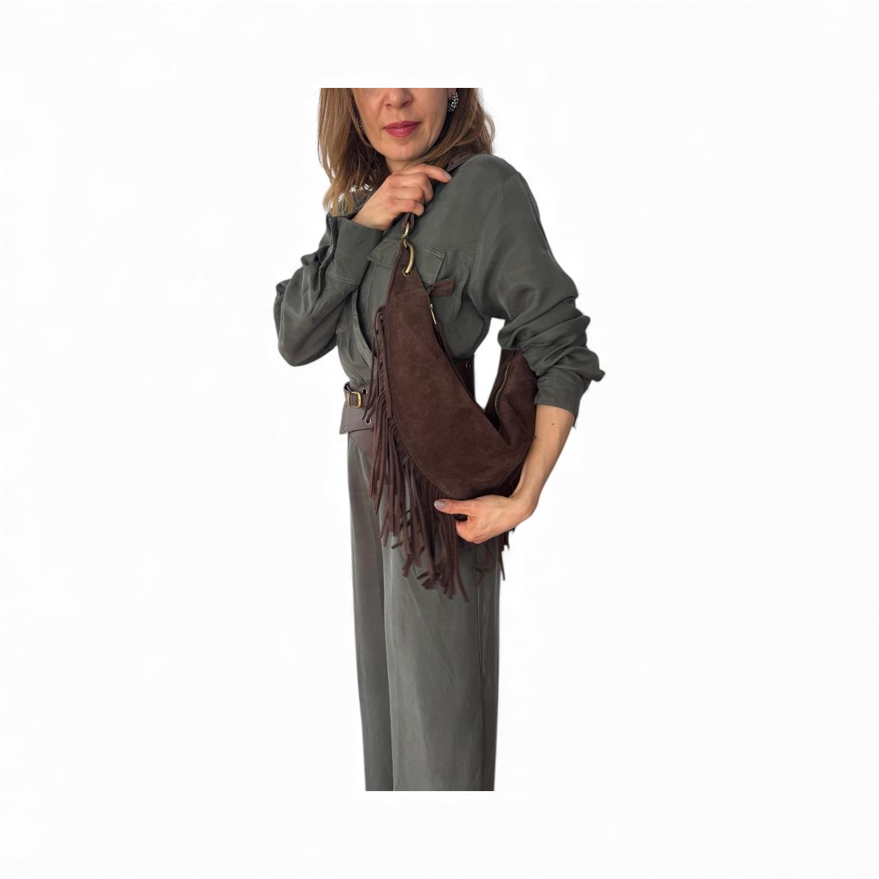Cartera tipo shoulder bag y crossbody, 100% cuero gamuzado, cierre con cremallera, forro interno impermeable y bolsillo interno.