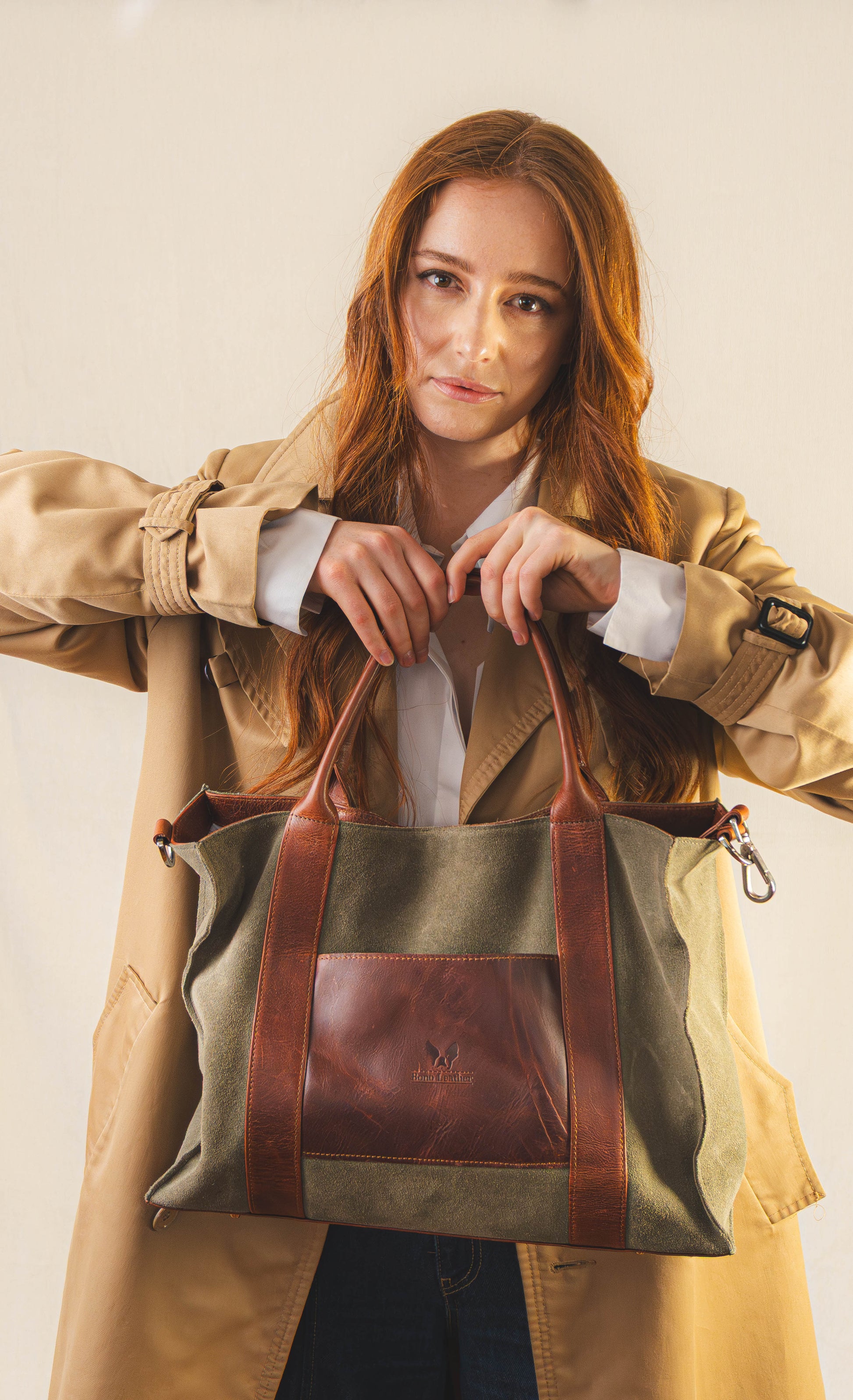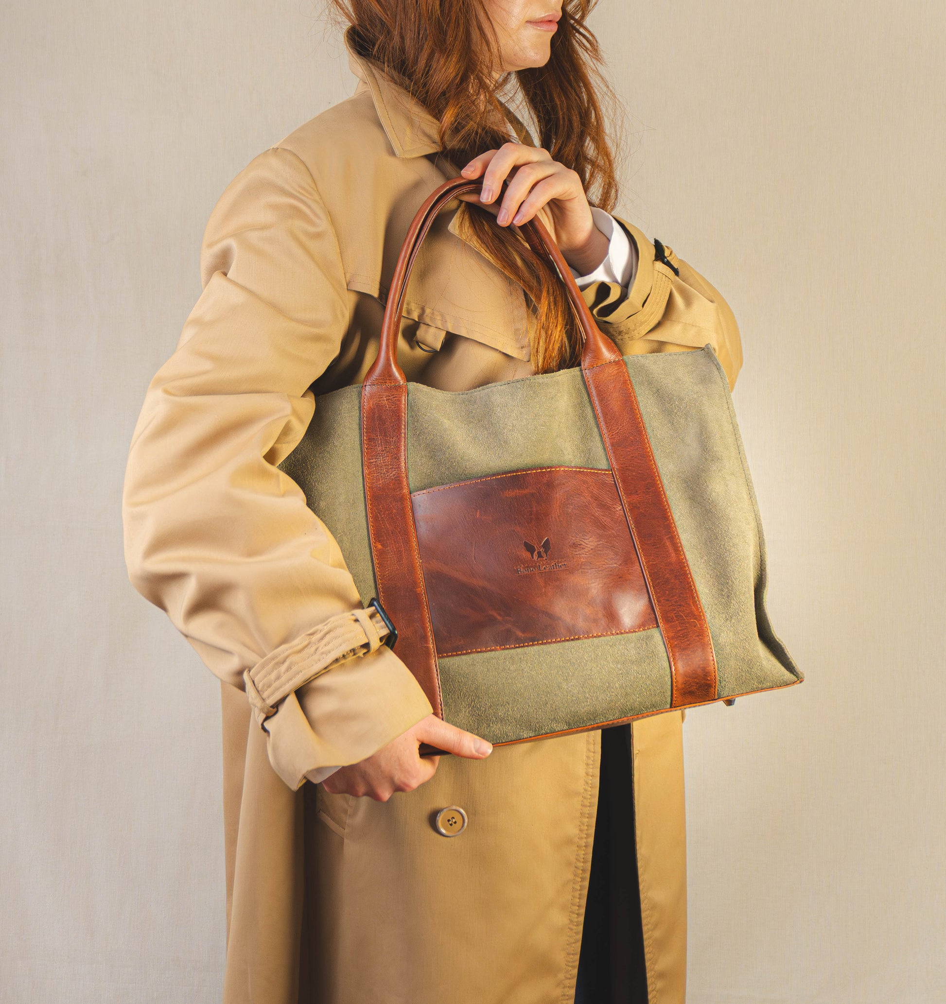 Maletín Unisex, combinación de cuero 100% curtido al vegetal y cuero gamuzado, forro impermeable al interior y bolsillo interno, 2 bolsillos externos, cargador opcional ajustable.