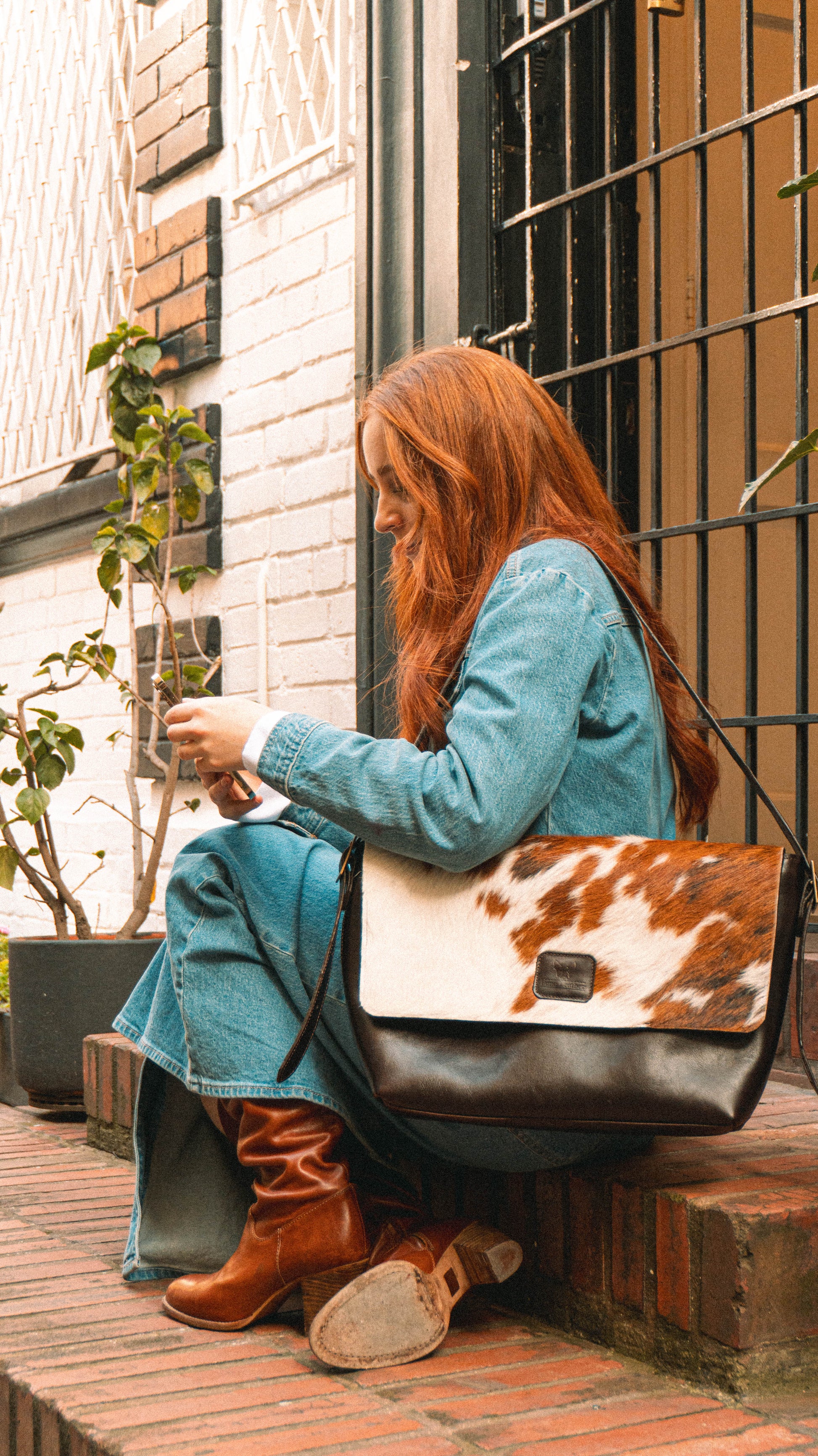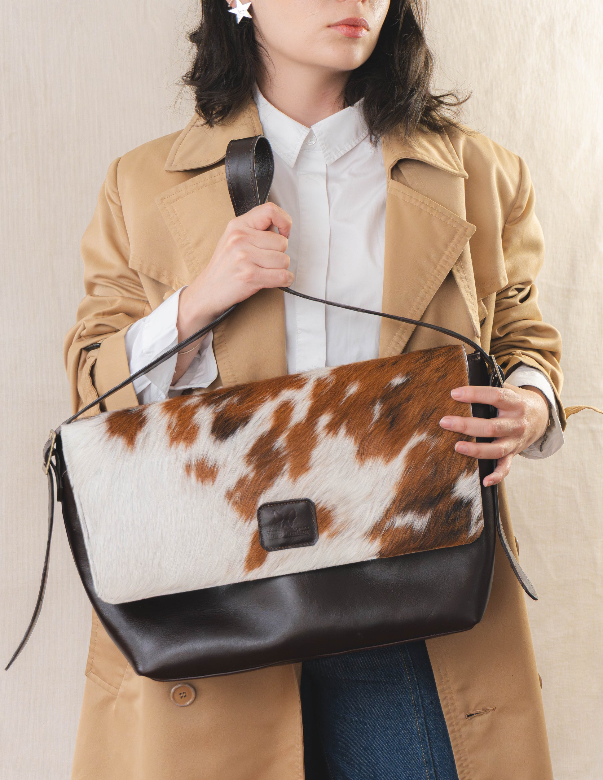 Cartera de hombro/crossbody, tipo maleta de diario, Mezcla de cuero vacuno 100% y tapa con cuero con pelo vacuno, forro impermeable en su interior, bolsillo interno, cargador ajustable.
