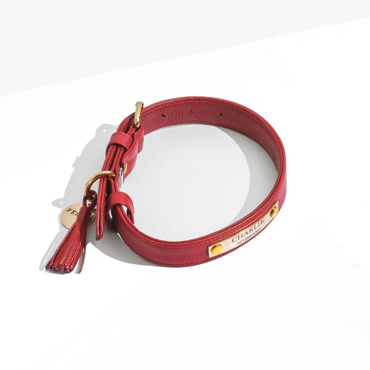 Collares para perros elaborados en suave cuero natural 100% libre de cromo y herrajes en zamak con baño en oro, para garantizar su resistencia y durabilidad. Hechos a mano por artesanos locales. El ancho de los collares es: XS – 1.5 cm; S – 2cm; M – 2.5cm; L – 3cm; XL – 3 cm. Para saber el largo y la talla adecuada se debe revisar la guía de tallas.