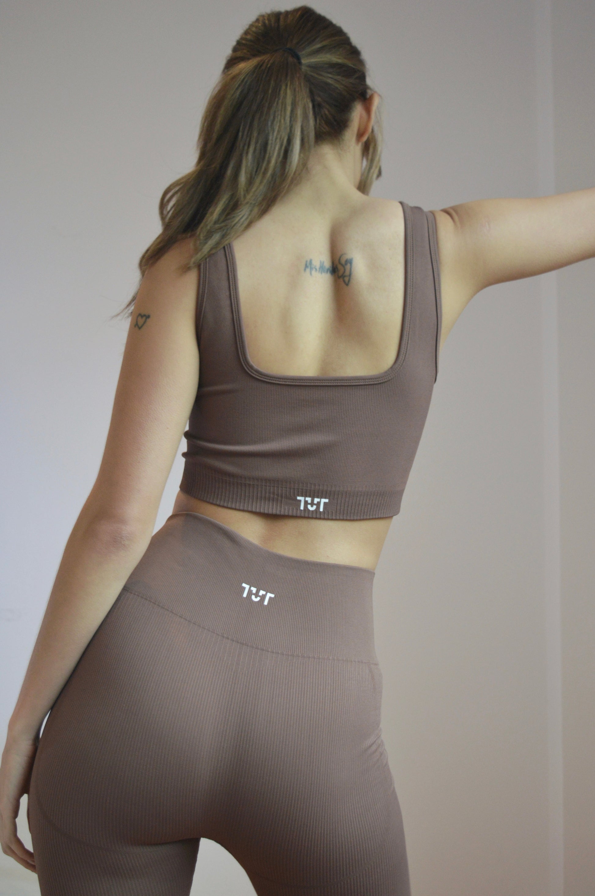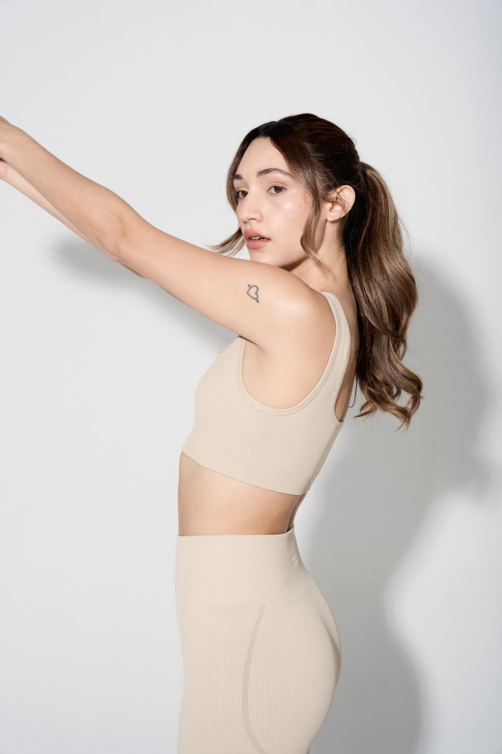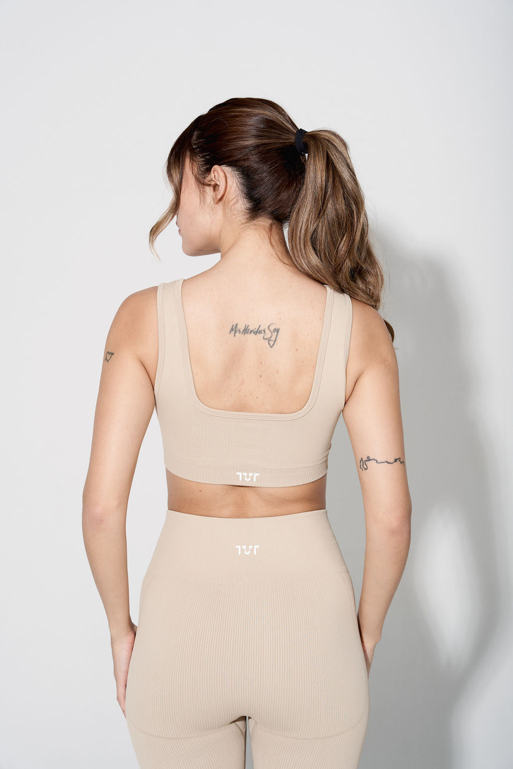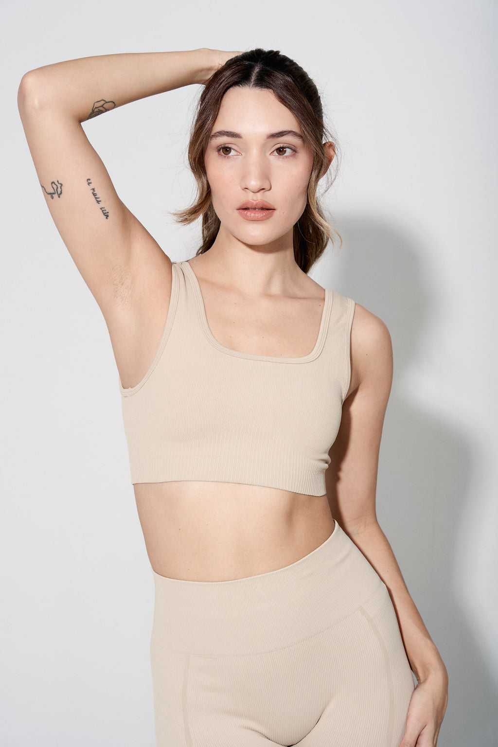 Top con tecnología Seamless y soporte medio, ideal para usar en tu día a día, dentro y fuera del gym, con discreto escote en la espalda.