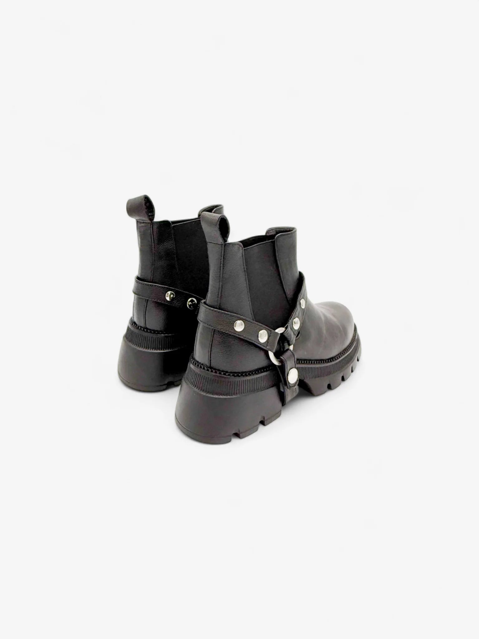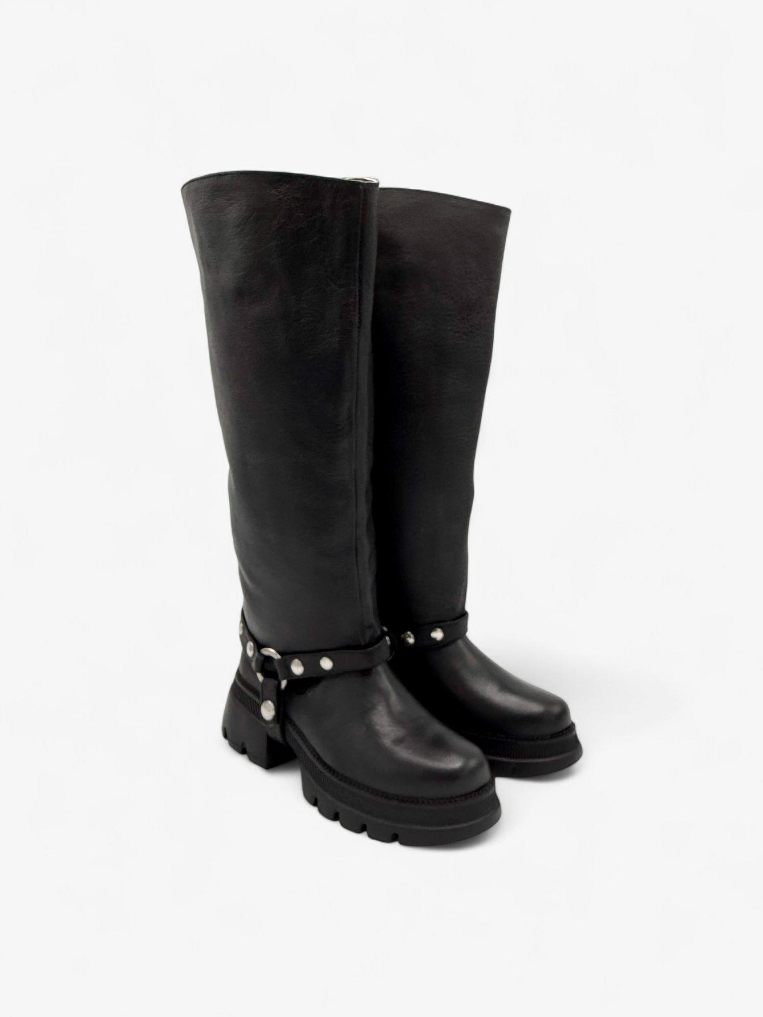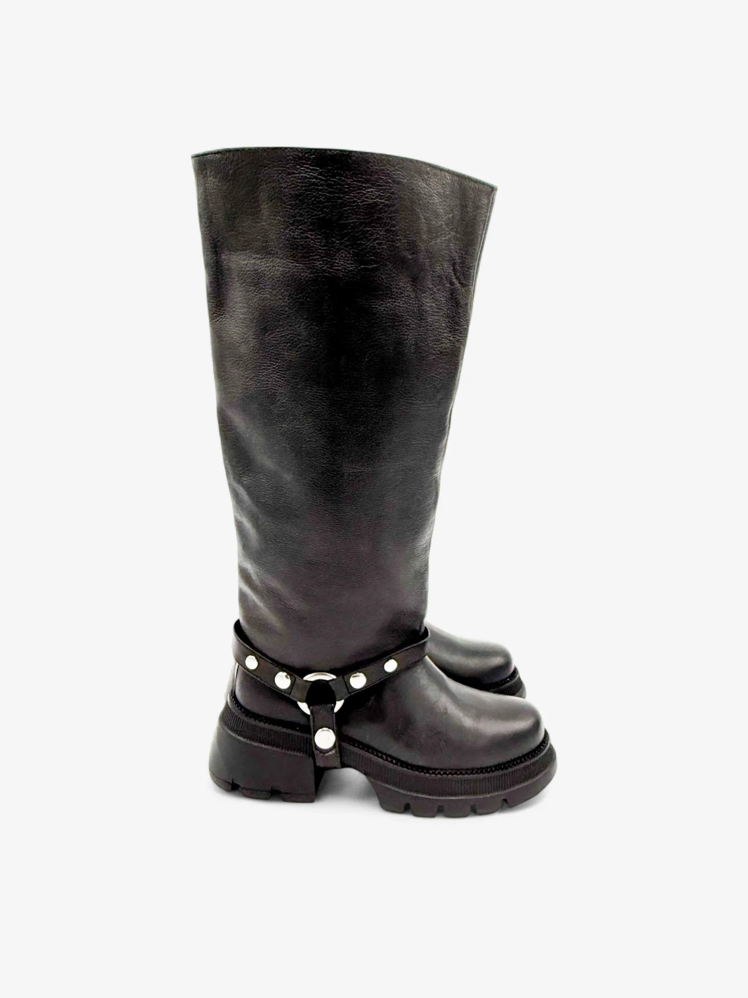 La pieza tubular superior —fabricada en el mismo cuero — se ajusta sobre el botín para lograr una bota alta con un look más atrevido. El cinturón con herrajes metálicos une ambas piezas.