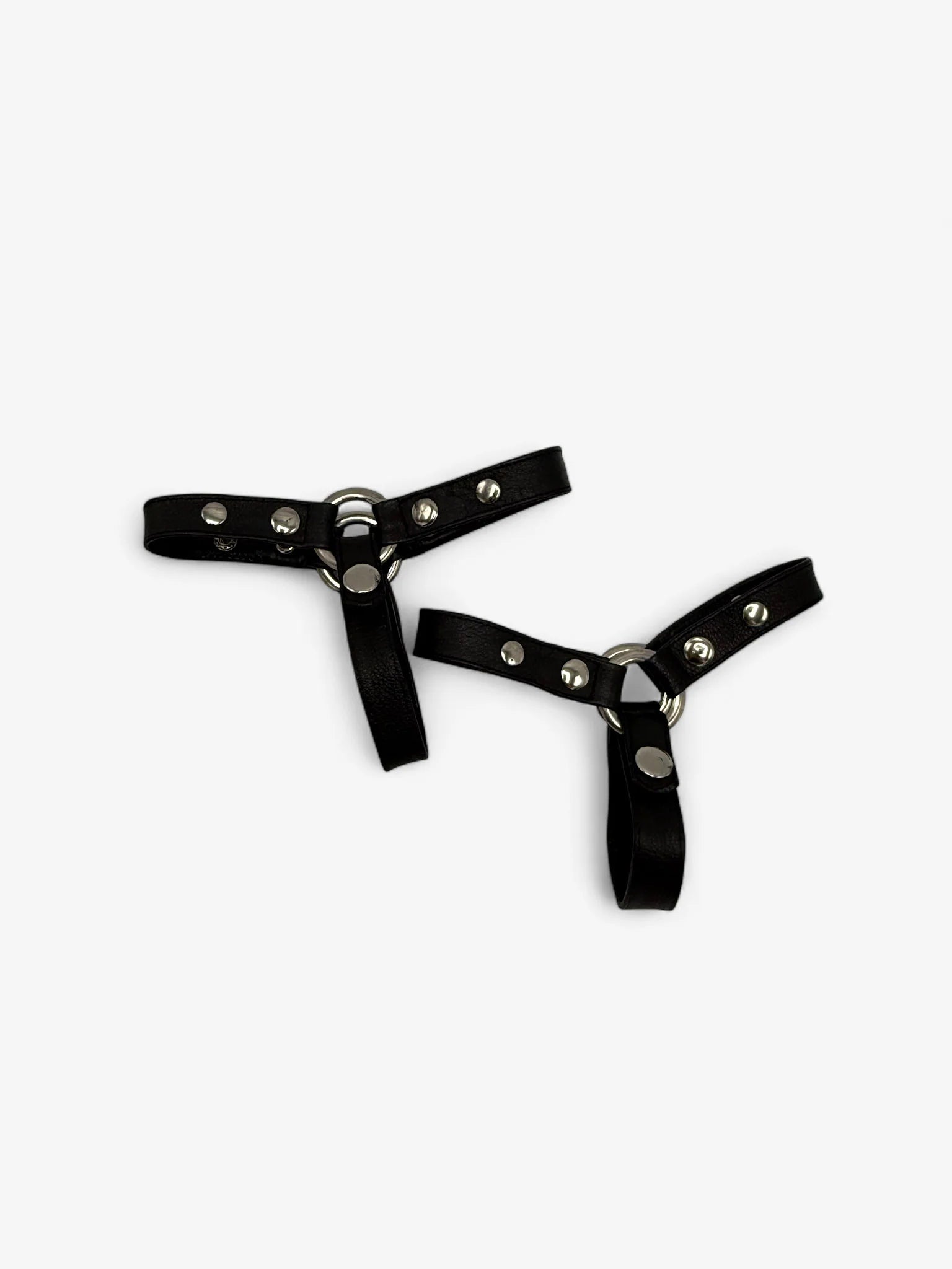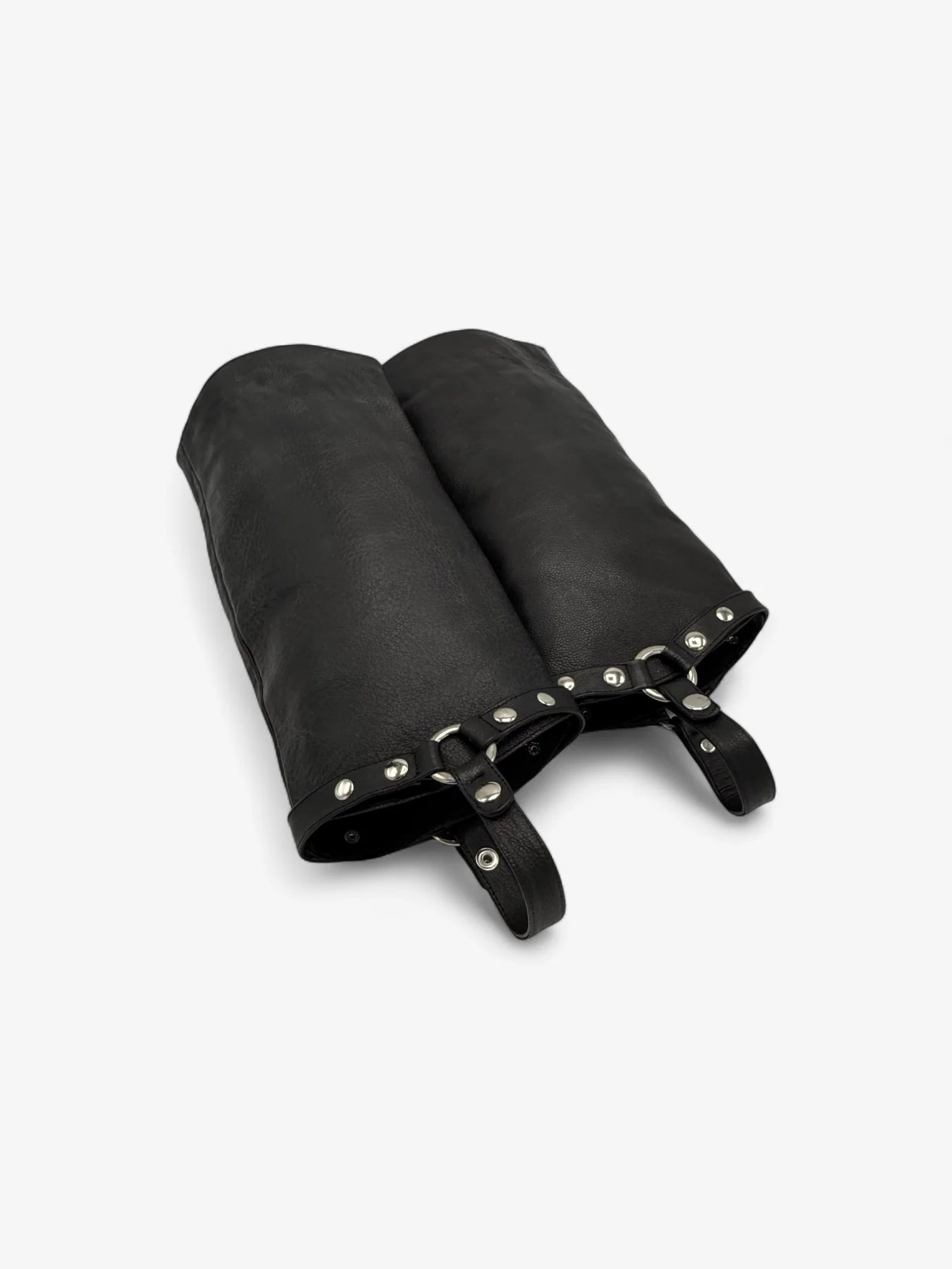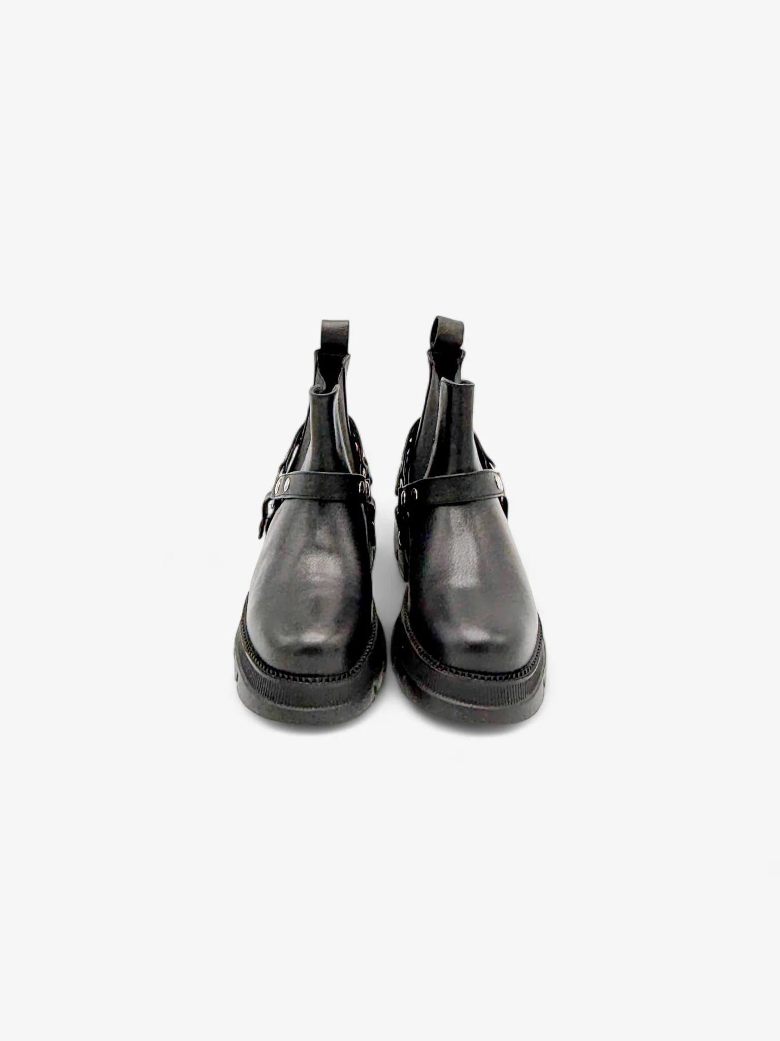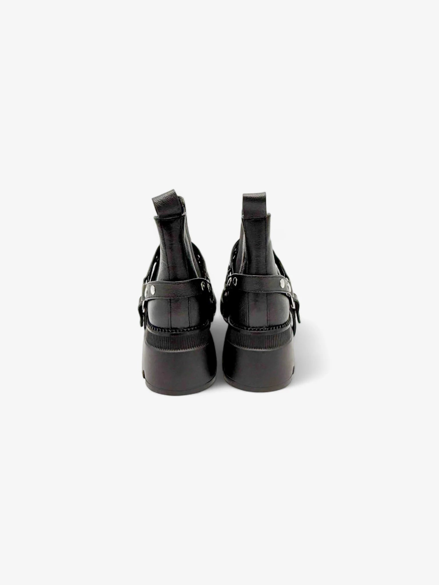 La pieza tubular superior —fabricada en el mismo cuero — se ajusta sobre el botín para lograr una bota alta con un look más atrevido. El cinturón con herrajes metálicos une ambas piezas.